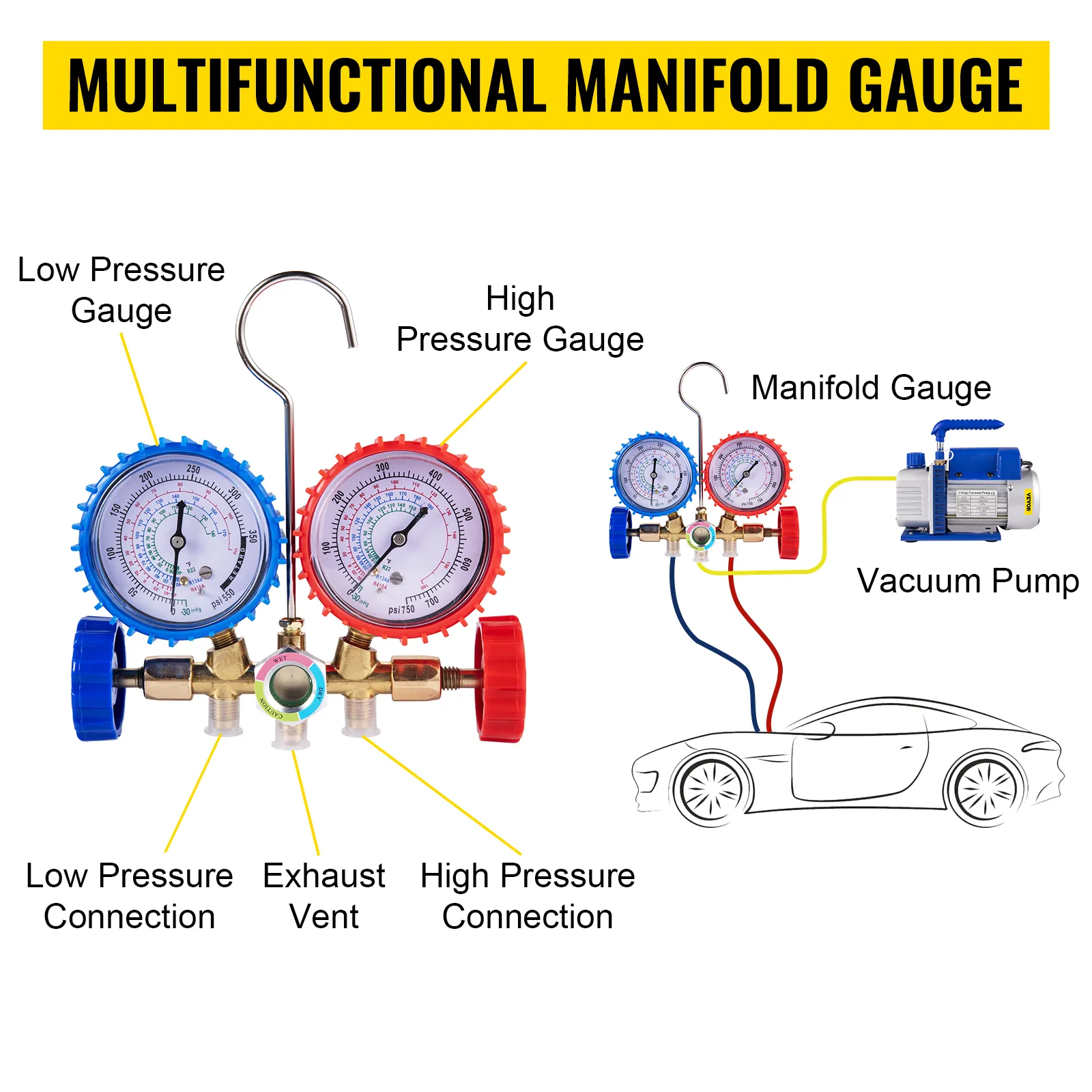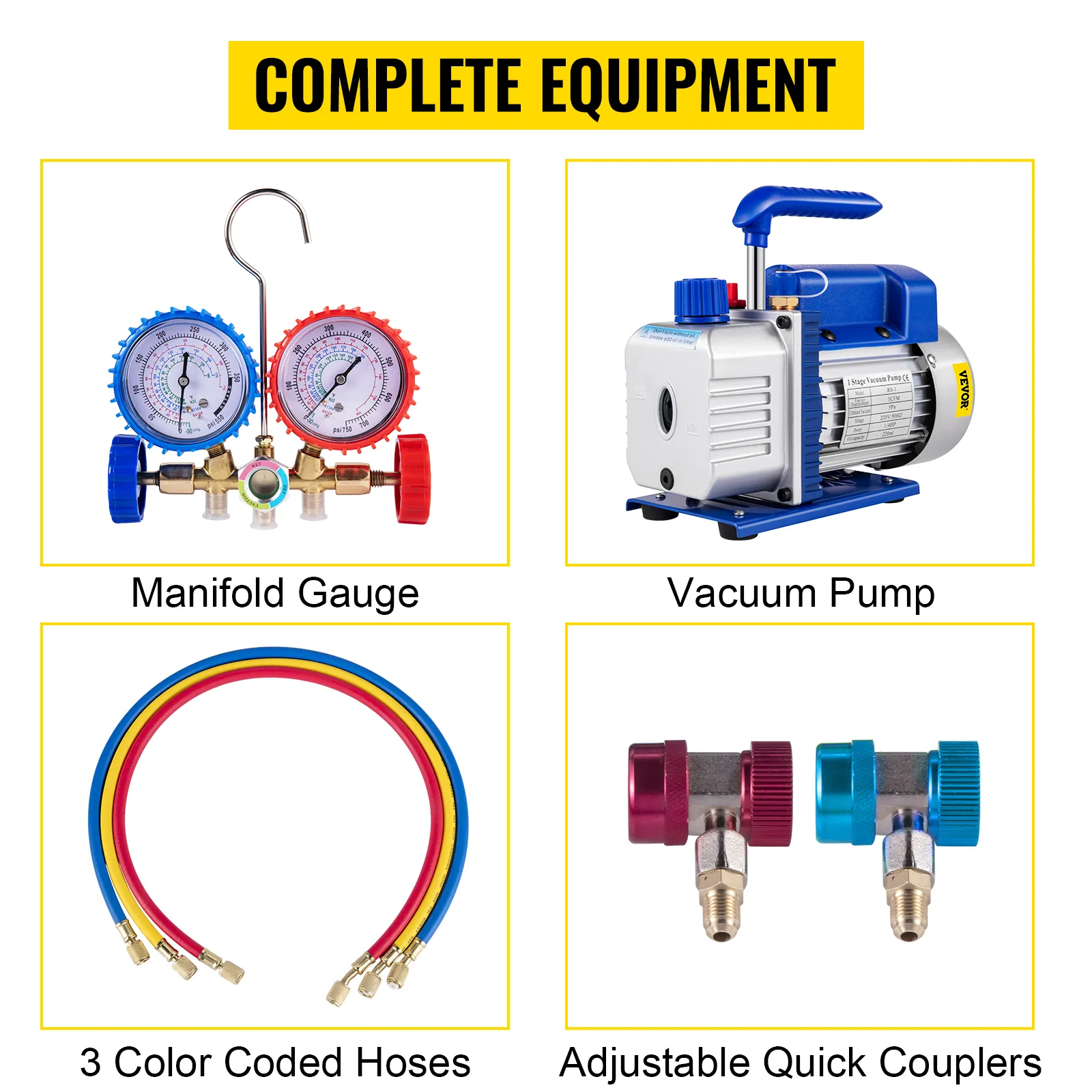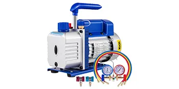 This professional refrigerant tool kit includes all the necessary tools you need, including a rotary vane vacuum pump, a pressure gauge set, three hoses, quick adjustable couplers.