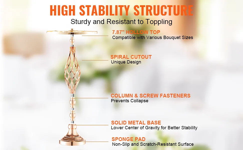 High-Quality Material: Made from premium carbon steel, this wedding floral stand is resistant to deformation and built to last. The surface is treated with a French gold electroplating process, providing a bright finish with vivid colors that are both attractive and easy to clean. It employs screw-fastened connections to prevent pin deformation, ensuring greater stability after assembly.