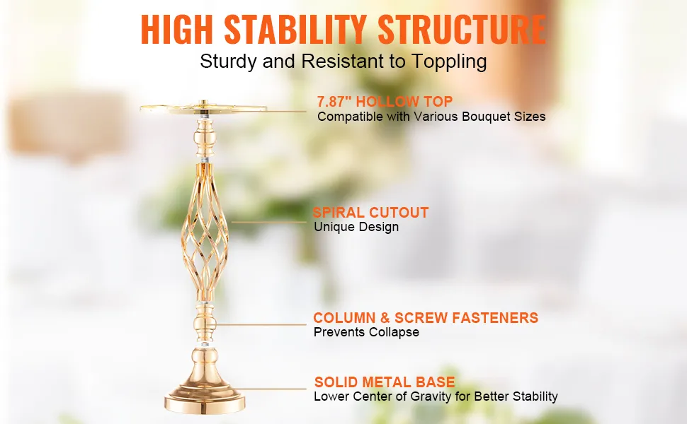 High-Quality Material: Made from premium carbon steel, this wedding floral stand is resistant to deformation and built to last. The surface is treated with a French gold electroplating process, providing a bright finish with vivid colors that are both attractive and easy to clean. It employs screw-fastened connections to prevent pin deformation, ensuring greater stability after assembly.