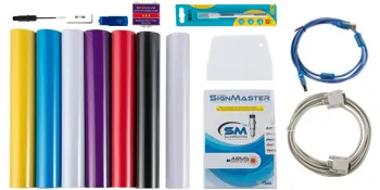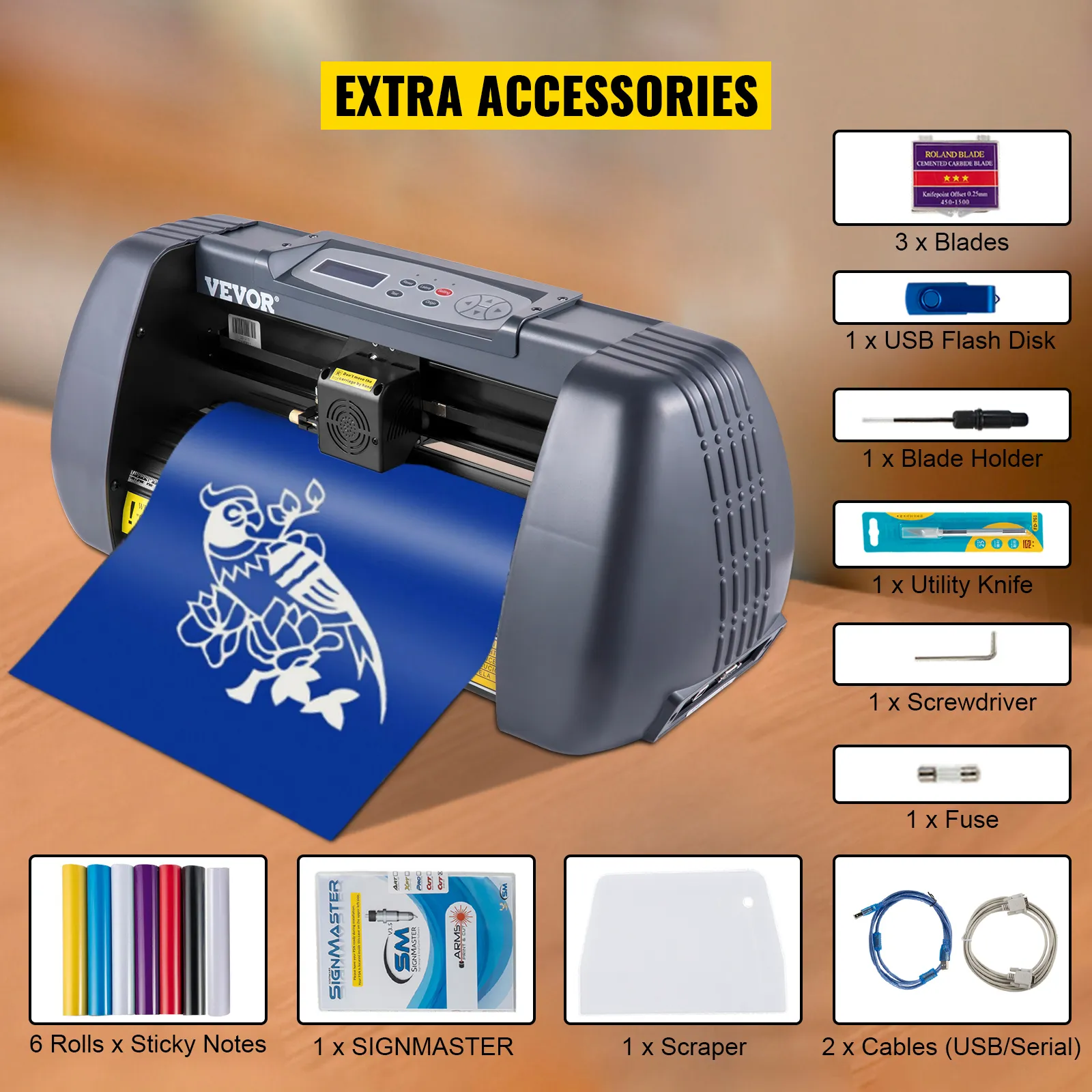 With extra 6 rolls of sticky notes (Color: black, white, red, purple, light yellow,blue),1 roll of textured paper (0.15 x 9 m/5.9" x 354.3"),1 utility knife,1 scraper,1 x SIGNMASTER Software, 1 x USB, 3 x Blades,3 x Cables, etc. Compact size can be placed on the table and easy to carry.