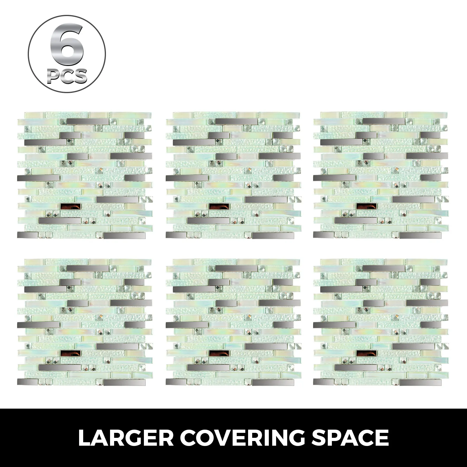 • 【INDOOR GLASS TILES】- Amount: 6pcs; One Sheet Size: 12"x12"; Thickness: 8mm; Material: Stainless Steel + Glass. Adopt eco-friendly material, anti-mold and wipe-clean surface.