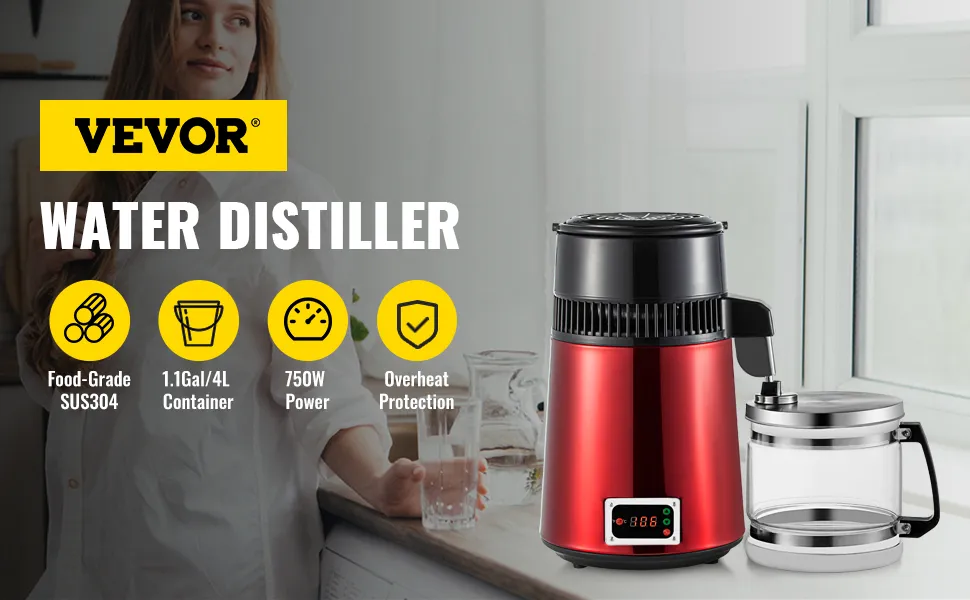 VEVOR's water distiller with upgraded temperature control panel safeguards your health and can help you get a continuous supply of distilled water, whether at home or in the office. The distiller can effectively dissolve VOCs and filter other impurities, and the distillation speed can reach 1 L/H. More importantly, the inner barrel is made of high-grade 304 stainless steel and has the function of keeping off dry burning. It is a perfect helper for your kitchen.