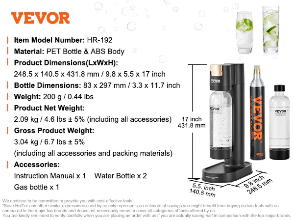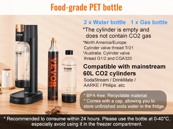 Cost-effective and Sustainable: We provide you with 2 1L food-grade PET bottles with caps for convenient storage. This sparkling water and soda maker includes 1 CO2 cylinder (the cylinder is empty and does not contain CO2 gas). With a replaceable cylinder design compatible with mainstream soda brands' 60L CO2 cylinders, one cylinder can make 180 bottles of soda water (330ml per bottle), making it more economical and eco-friendly for repeated use.