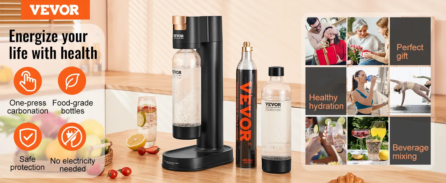 Enjoy a glass of soda water during tiring work for a tasty, healthy, and revitalizing experience without harming your health. The non-electric design seamlessly integrates into homes/offices/beverage shops or for portable travel, ensuring happiness accompanies you.