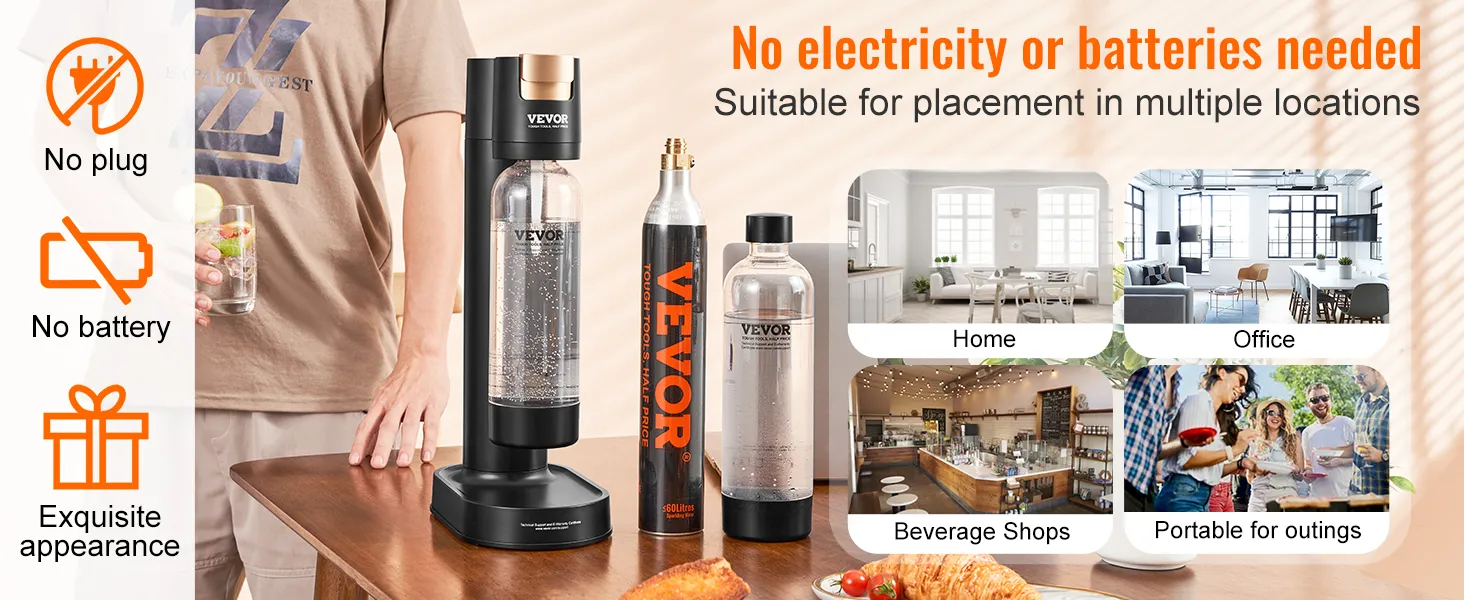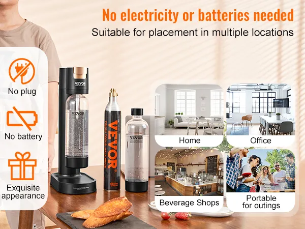 No Electricity Needed: This sparkling water maker kit doesn't require electricity or batteries, enhancing its flexibility and portability. With an excellent design and sleek profile, it perfectly integrates into your home or office space. You can also find it in coffee & beverage shops, at camping & gatherings, making it suitable for various occasions!