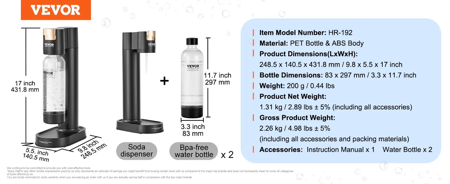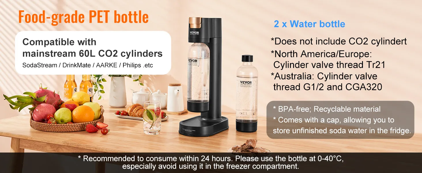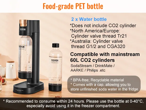 Cost-effective and Sustainable: We provide you with 2 1L food-grade PET bottles with caps for convenient storage. This sparkling water and soda maker does not include a CO2 cylinder. With a replaceable cylinder design compatible with mainstream soda brands' 60L CO2 cylinders, one cylinder can make 180 bottles of soda water (330ml per bottle), making it more economical and eco-friendly for repeated use.