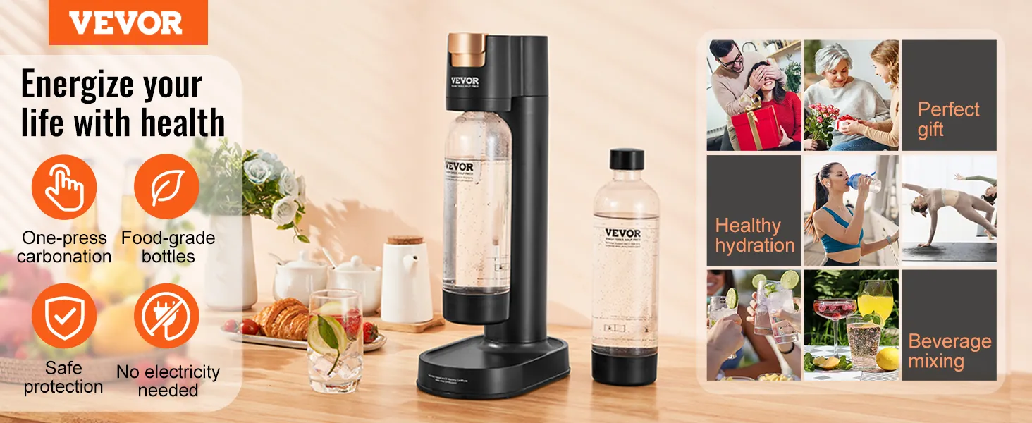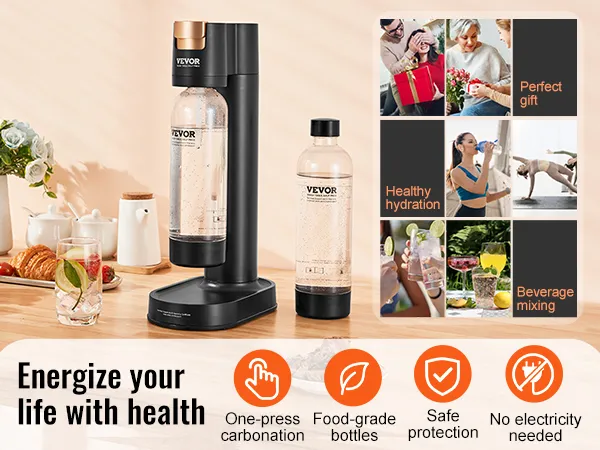 Enjoy a glass of soda water during tiring work for a tasty, healthy, and revitalizing experience without harming your health. The non-electric design seamlessly integrates into homes/offices/beverage shops or for portable travel, ensuring happiness accompanies you.
