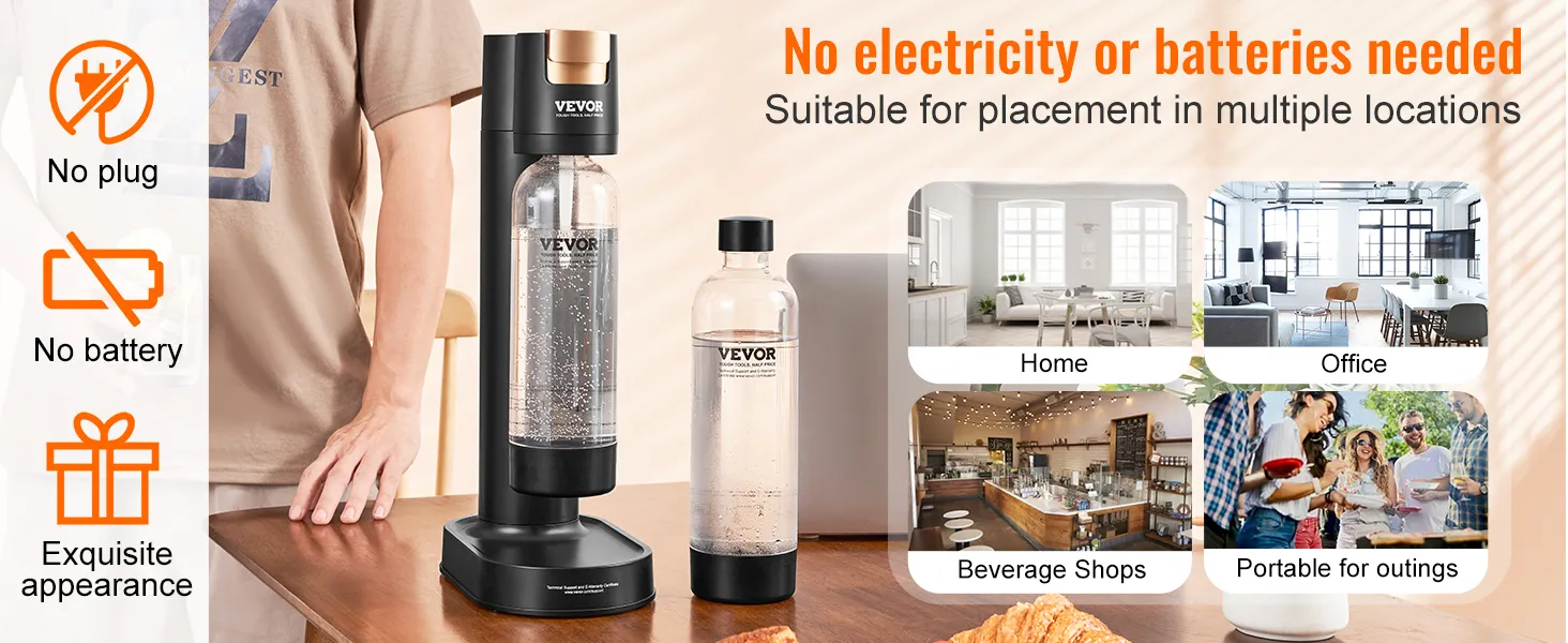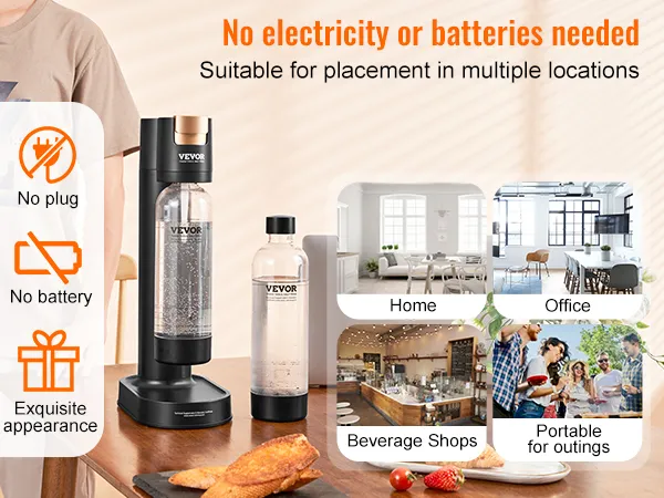 No Electricity Needed: This sparkling water maker kit doesn't require electricity or batteries, enhancing its flexibility and portability. With an excellent design and sleek profile, it perfectly integrates into your home or office space. You can also find it in coffee & beverage shops, at camping & gatherings, making it suitable for various occasions!