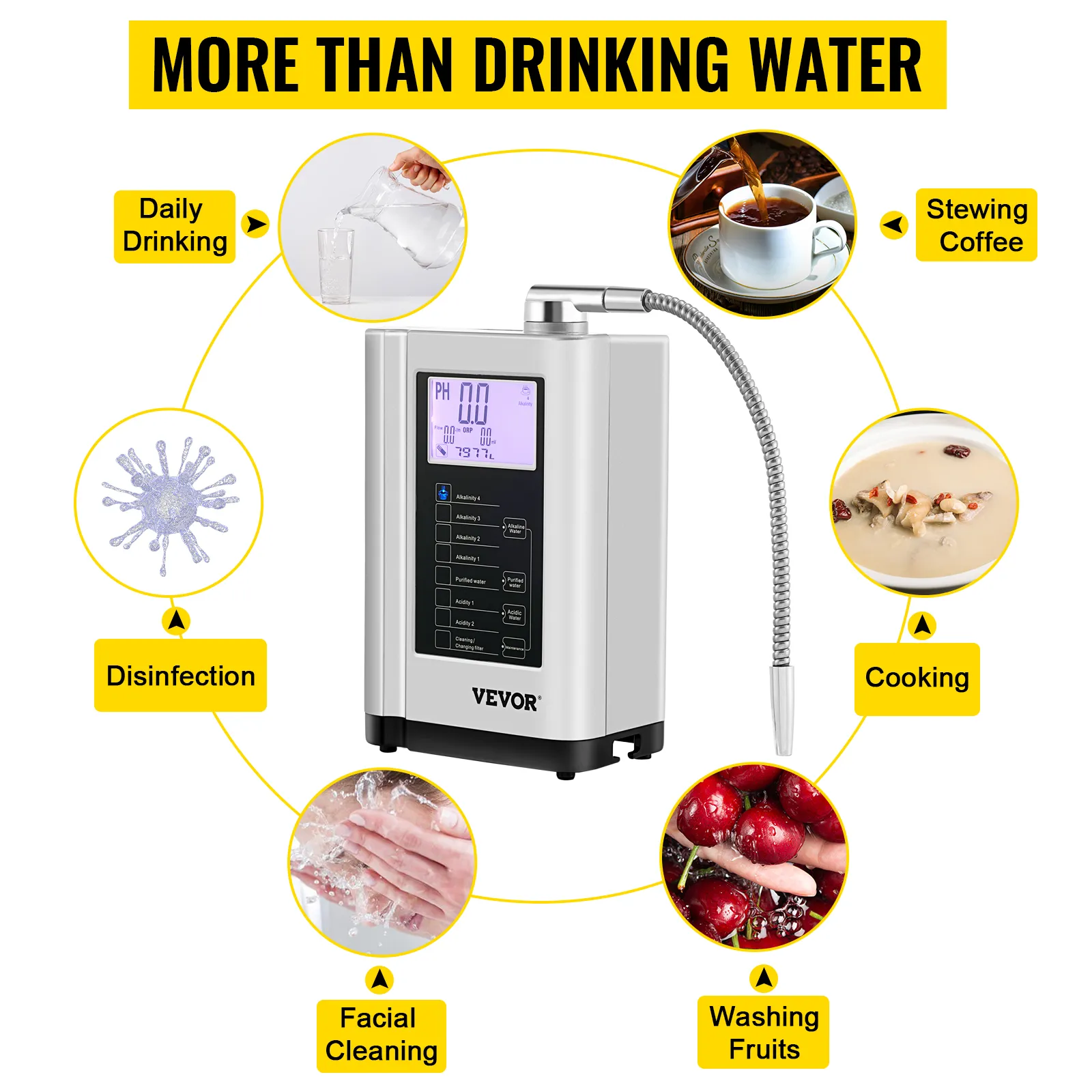 Our alkaline & acid water ionizer machine is perfect for daily use, containing 7 nutritious water options. The pH value ranges from 3.5 to 10.5. The 3.8-inch colorful LCD screen and touch panel facilitate convenient operation. Intelligent voice reminders and a practical water filter are also included. The 2-way installation gives you more choices of where to place it. Not only can it produce alkaline water for daily drinking, but it is also ideal for cooking, food disinfection, body cleaning, sterilization, chemicals elimination, etc.