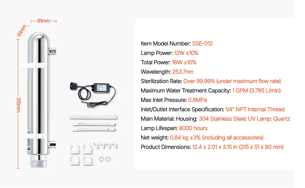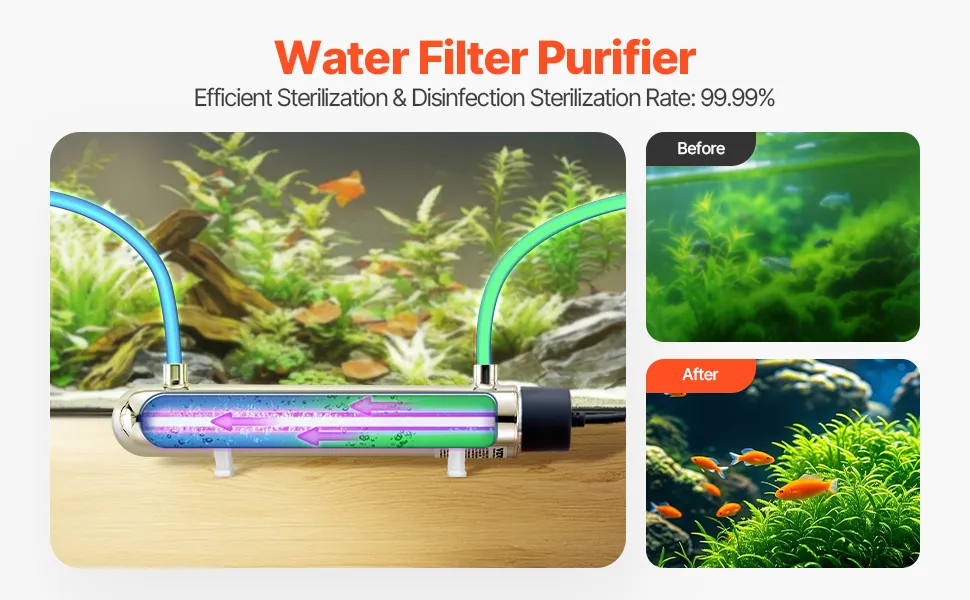 The ultraviolet water purifier filter provides a 99.99% sterilization rate for clear, bacteria-free water. With a durable stainless steel chamber and a UV lamp lasting up to 8,000 hours, it ensures long-lasting performance. Easy to install and operate, enjoy purified water instantly!