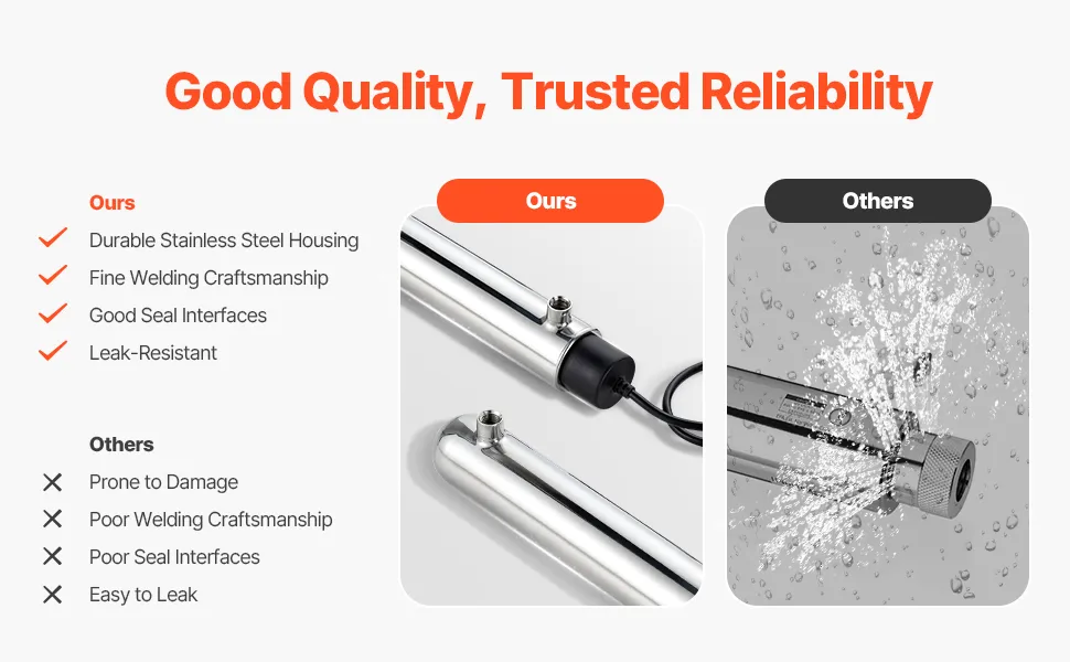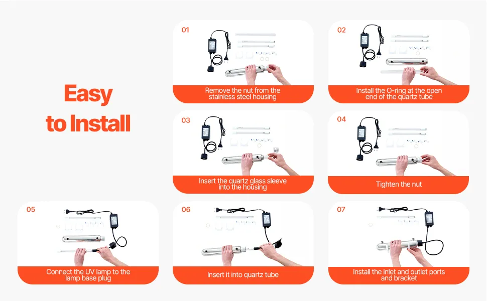 Secure & Reliable Design: The pipe body is ultrasonic high-temperature cleaned to ensure no impurities or foreign matter remain, avoiding secondary contamination. Equipped with a UV system fault alarm for easy troubleshooting. The durable quartz sleeve provides secure guard for the UV lamp. The sealing and welding processes are good, avoiding water leakage.