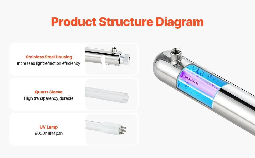 The innovative three-layer design integrates the stainless steel chamber, quartz glass sleeve, and UV lamp, significantly enhancing ultraviolet reflection efficiency. With a remarkable UV lamp lifespan of up to 8,000 hours, this filter provides extended and consistent performance.