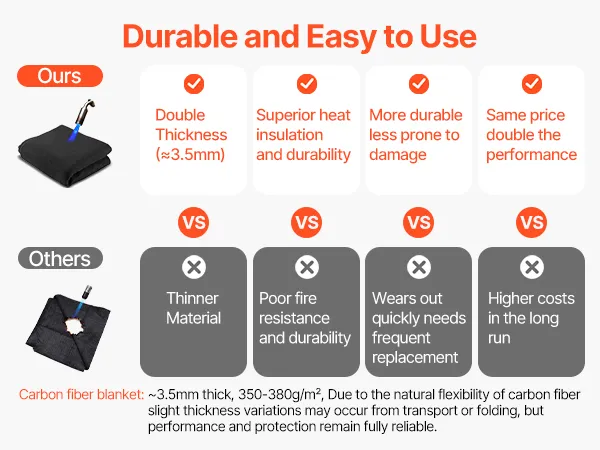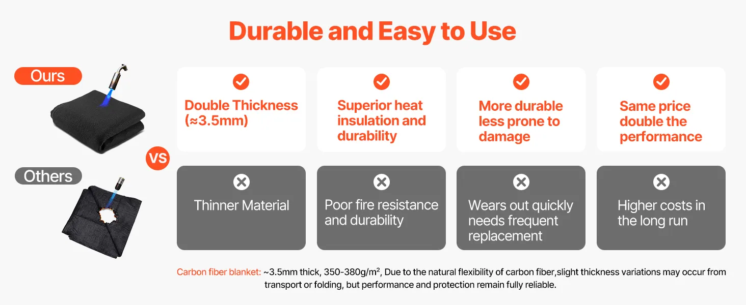 Enhanced Durability: Made from 3.5 mm thickened carbon fiber, our heat-resistant welding blanket is tearing and wear resistant. Reinforced heat-sealed edges prevent unraveling, fraying or damage for long-lasting reliability