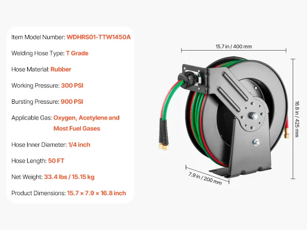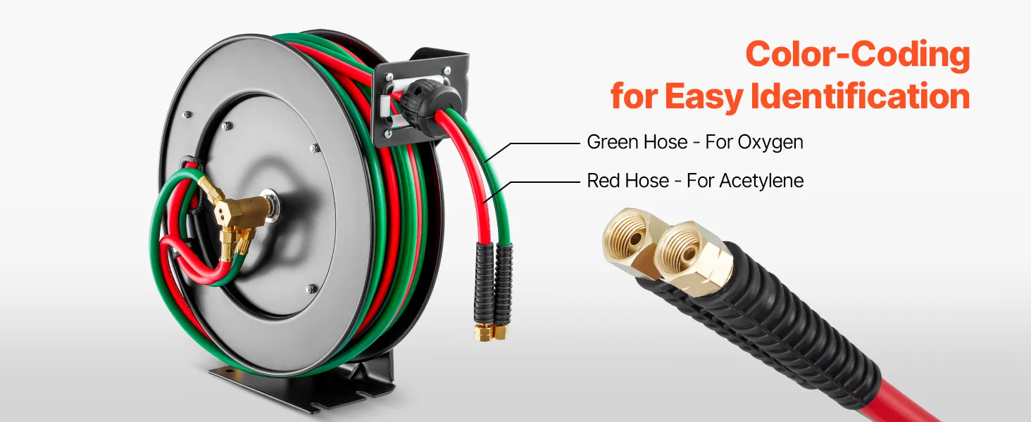 Our 50FT x 1/4-inch retractable welding hose reel is your solution to hose kinks and tangles. Featuring T-Grade oxygen-acetylene rubber hose with max 300 PSI pressure, rugged steel housing, any-length lock and auto-rewind function, it ensures smooth and reliable operation for your welding needs.