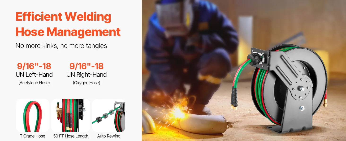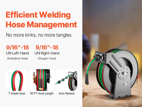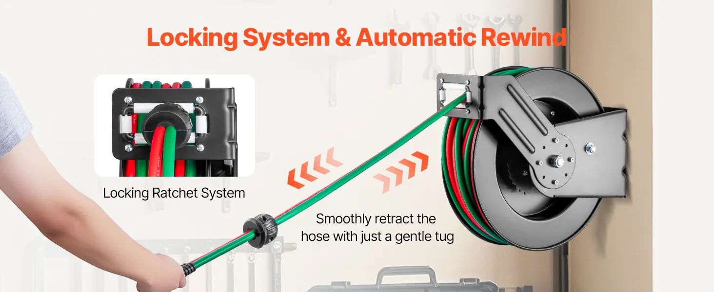 Auto Rewind: With VEVOR's auto-rewind welding hose reel, managing your hose is simple and tangle-free. Simply give the hose a gentle tug and it will retract smoothly. The reel also has 4 non-snag rollers that reduce hose wear and abrasion. And you can adjust the stopper to lock the hose at any desired length.