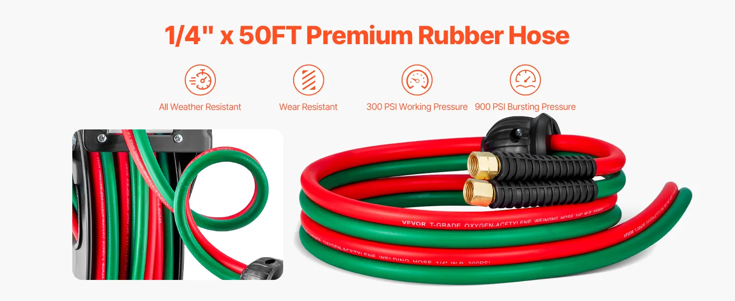 50FT T-Grade Welding Hose: VEVOR 50FT x 1/4-inch oxygen acetylene rubber hose is suitable for use with oxygen and most fuel gases, such acetylene, propane or natural gas. It supports 300 PSI maximum working pressure and 900 PSI bursting pressure, offering exceptional durability and efficient gas transmission for welding tasks.