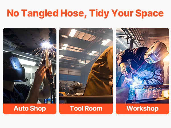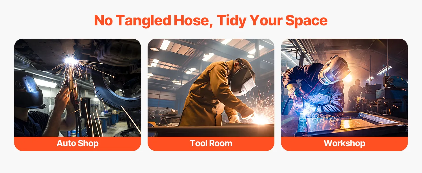 The heavy-duty welding hose reel ensures a clutter-free workspace by automatically retracting and neatly storing the hose. Perfect for auto shops, tool rooms, and workshops, it helps you maintain a clean and professional work environment.