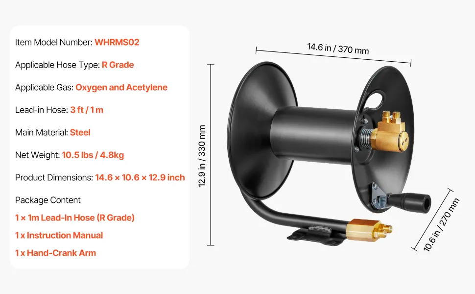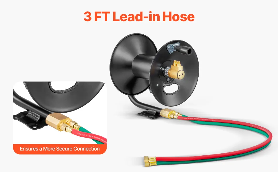 Compatible with R-Grade Hose: This welding hose reel comes with a 3ft (1m) lead-in hose, ensuring smooth transfer of oxygen and acetylene to welding equipment. Equipped with 9/16"-18 LH / RH B fittings, it ensures secure and reliable connections. (NOTE: The Welding Hose is Not Included.)