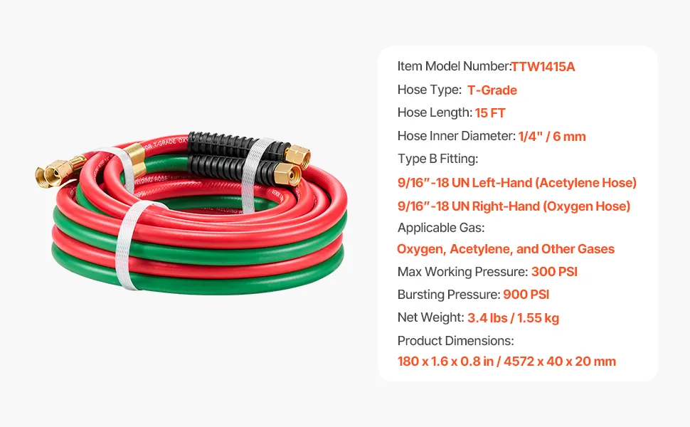 15FT Twin Welding Hose: VEVOR 15FT x 1/4-inch oxygen acetylene hose is suitable for use with oxygen and fuel gases, such acetylene, propane or natural gas. It supports 300 PSI maximum working pressure and 900 PSI bursting pressure, offering exceptional durability and efficient gas transmission for welding tasks.