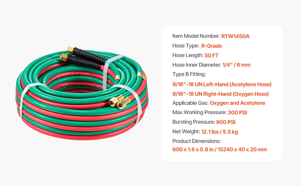50FT Twin Welding Hose: VEVOR 50FT Long x 1/4-inch ID oxygen acetylene hose supports a maximum working pressure of 300 PSI and a bursting pressure of 900 PSI, offering exceptional durability and efficient gas transmission for your welding and cutting tasks.