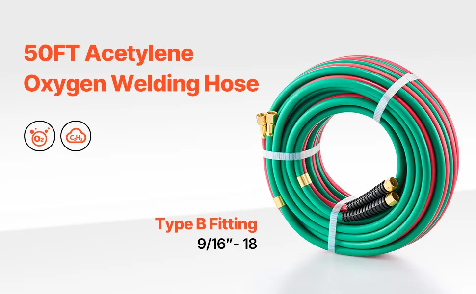 This 50FT x 1/4-inch R-grade oxygen acetylene twin hose supports 300PSI working pressure and 900PSI bursting pressure. Made of durable rubber material, it resists kinks and tangles, with 9/16"-18 LH/RH B fittings and a clear color-coding system, perfect for welding, soldering and cutting tasks.