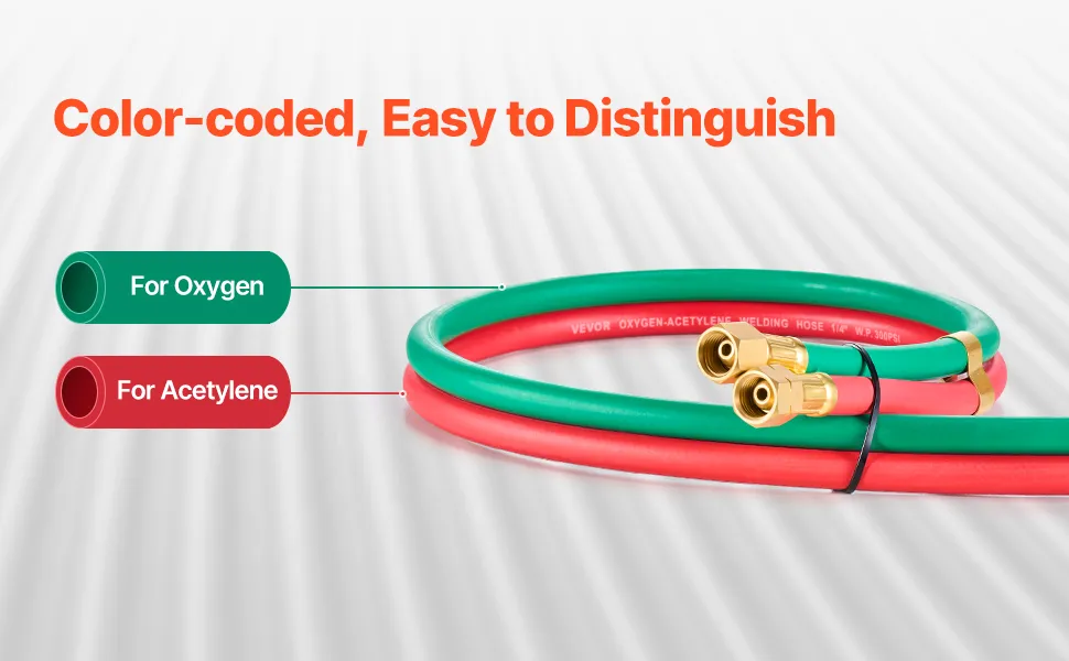 Clear Color-Coding System: Designed with a clear and distinguishable color-coding system, the red hose is for acetylene, and the green hose is for oxygen. This feature helps users quickly identify gas types, improving working efficiency and ensuring safer operations.