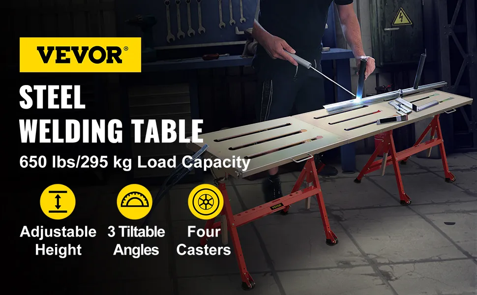 VEVOR's metal welding table with adjustable height and tiltable tabletop provides extra flexibility and versatility. Simultaneously, those thoughtful details of slots, guide rails, and the tool rack have drastically added convenience for your weld. Even the most unruly and awkwardly shaped projects can find an appropriate spot on our welding table.