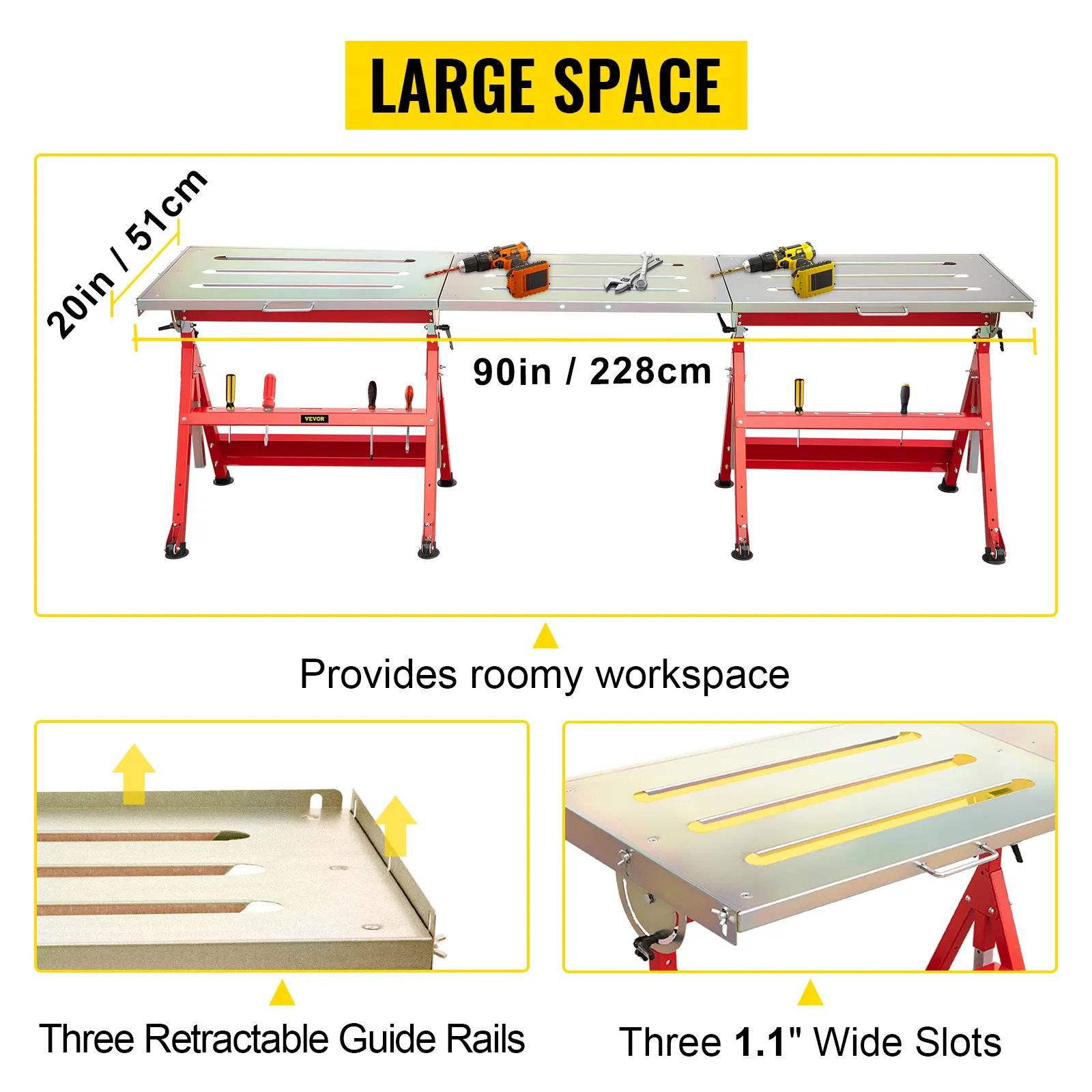90" x 20" Countertop: It's large desktop size (90" x 20"/228 x 51 cm) can meet your different working needs. Nine 1. 1" /28 mm slots in the tabletop allow for insertion of clamps to reach any point on the table. Five retractable, perpendicular steel guide rails can be used as guides, stops, or clamping edges.