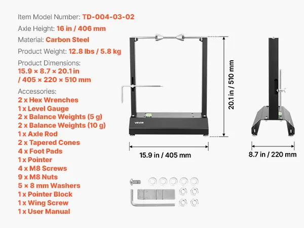 Practical Accessories: The motorcycle bike wheel balancer comes with two sets of 5 g and 10 g weights for fine adjustments. Four adjustable foot pads and a bubble level keep the stand level on uneven ground. A wrench is included for easy frame assembly