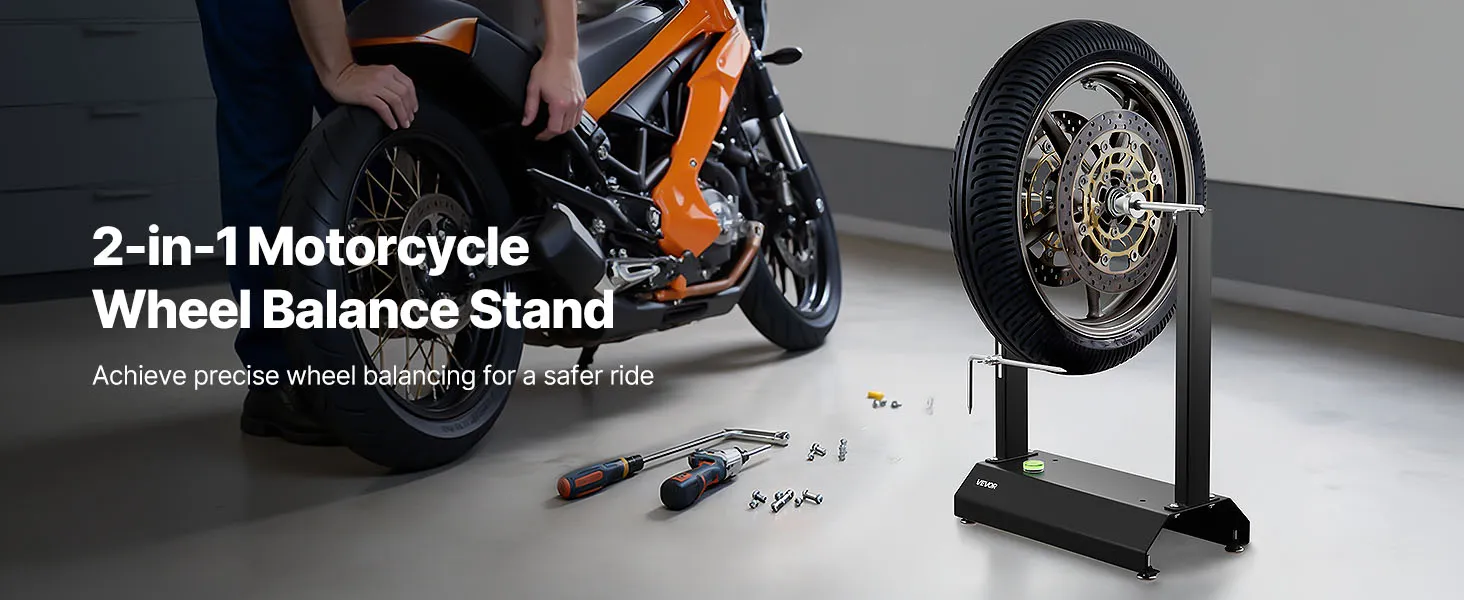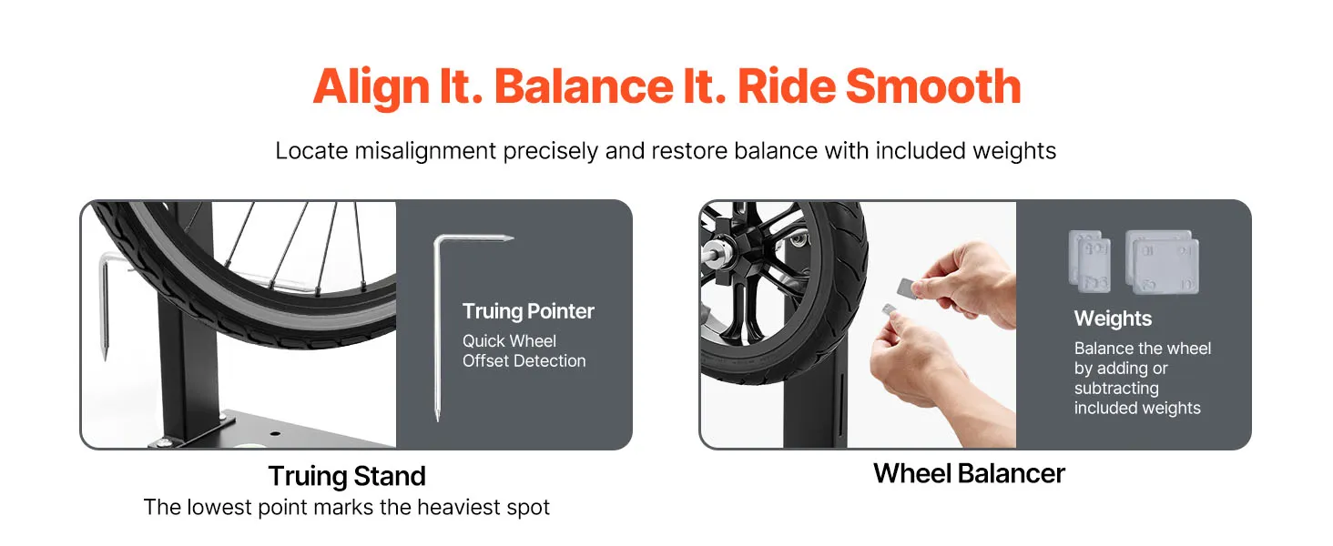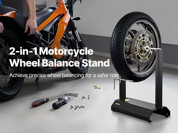 Wheel Balancer & Truing Stand: This motorcycle wheel balancer helps identify the heaviest wheel point and correct imbalance with weights on the opposite rim side. It evenly distributes mass, reducing high-speed vibration and delivering a smoother ride