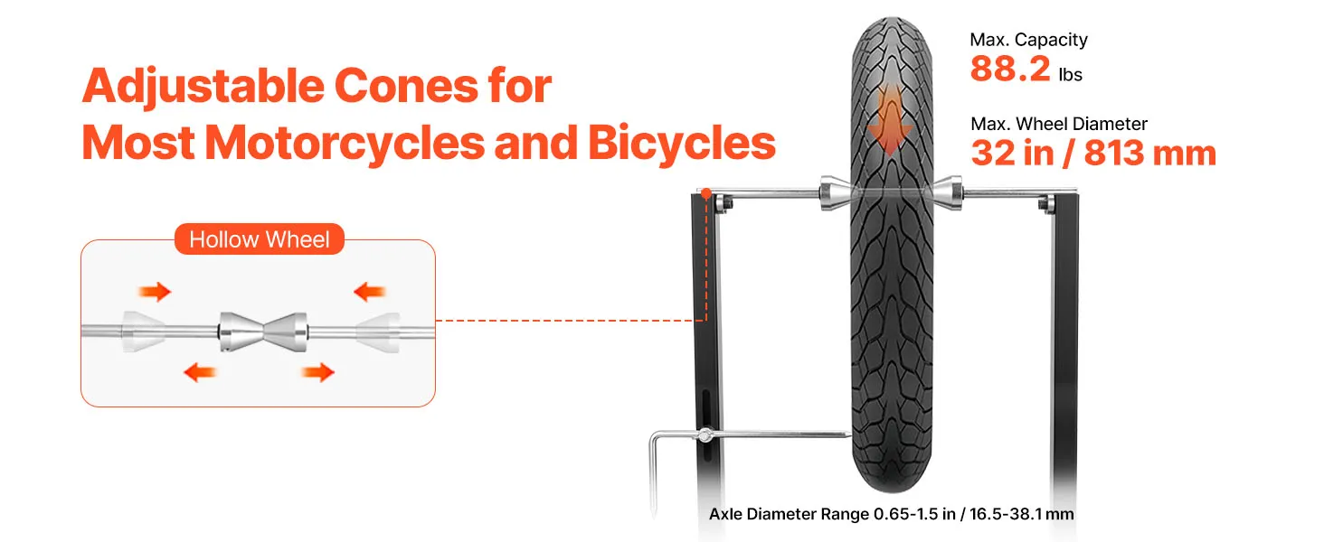 Fits Hollow Wheels: Our motorcycle bicycle wheel balancer works with most hollow motorcycle and bicycle wheels. It accommodates axle diameters from 0.65-1.5 in, wheel sizes up to 32 in, and supports loads up to 88.2 lbs