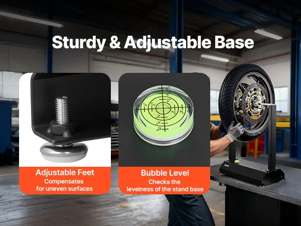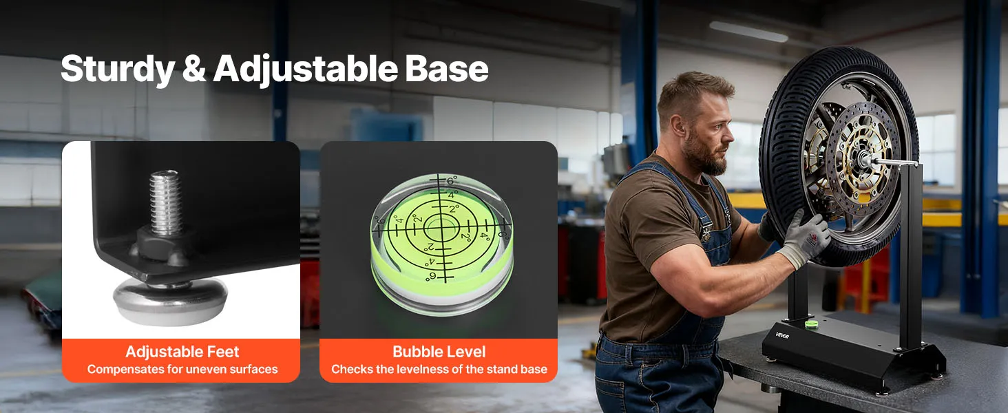 Built with heavy-duty carbon steel, this tire balancer stand features four adjustable leveling feet for a stable base. A bubble level helps check alignment so you get professional-grade results every time.