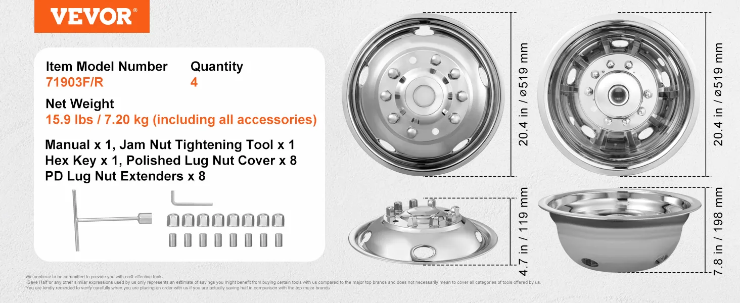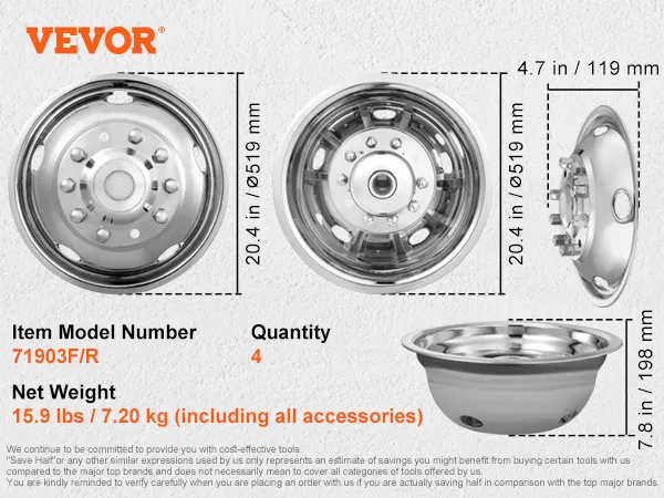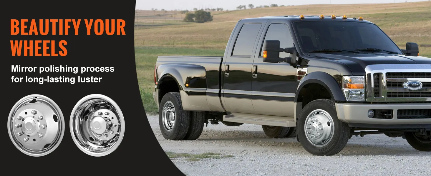 The VEVOR wheel simulators bring style to any truck. Their mirror-polished finish adds a sleek look. These wheel simulators fit Ford F450 and F550 trucks. They are perfect for both old and new models. These wheel covers make any work truck look classy. They help create a professional image. The stainless steel material gives a premium look. You get the look of expensive wheels at a fraction of the cost. It's a simple yet effective way to add value to your vehicle. Their polished finish makes them stand out, making these wheel simulators a good investment.
