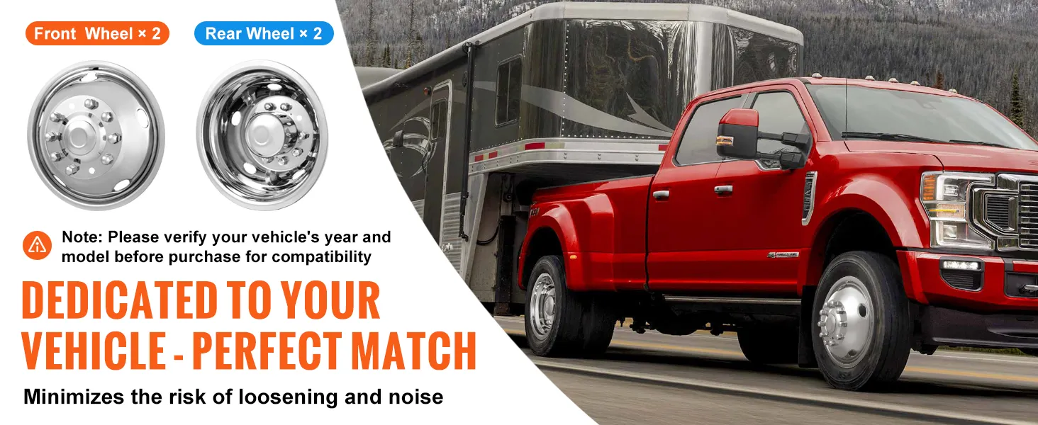 Fit for Ford F450/F550: Our 2 front wheel simulator and 2 rear wheel simulator, perfectly designed to match the Ford F450/F550 (2005-2020) with 19.5-inch wheel diameter. Crafted with precision to mimic the original wheel's appearance, ensuring a seamless fit. Important: Verify your vehicle's year and model before purchasing to ensure compatibility.