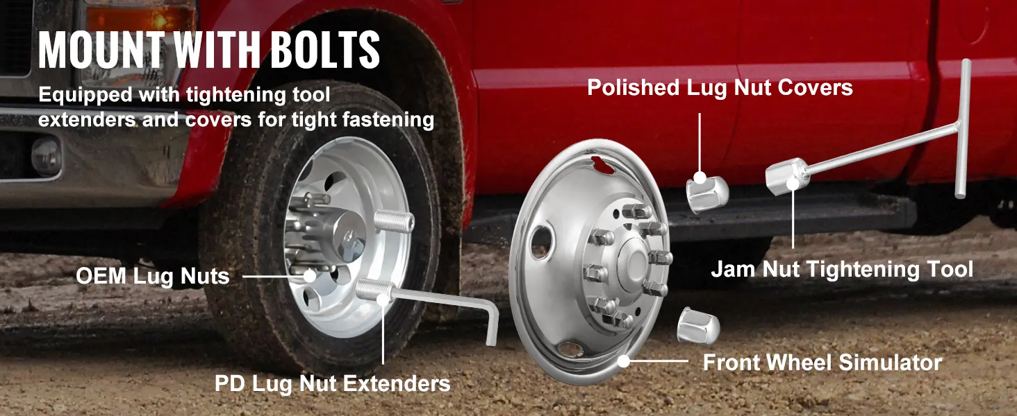 We supply you with a full set of matching extenders and covers for a easy setup. Align with the hub hole and tighten using a wrench. Once correctly installed, the wheel simulators won't come loose. Note: Use only the provided tools from the kit for tightening; avoid using an impact wrench.