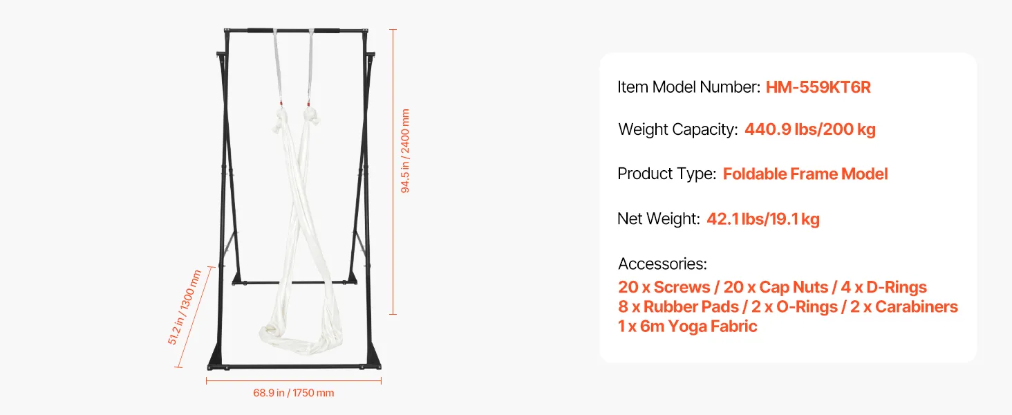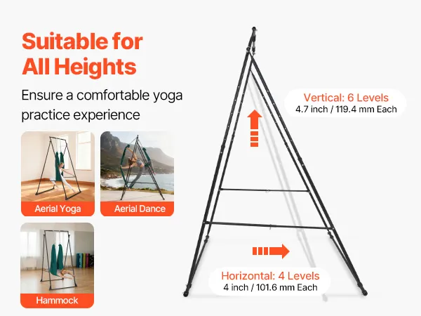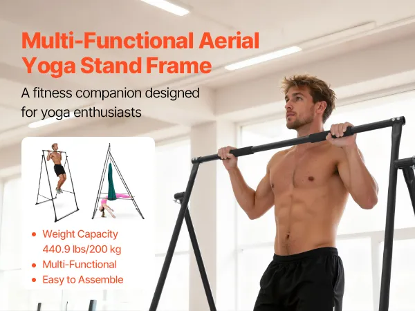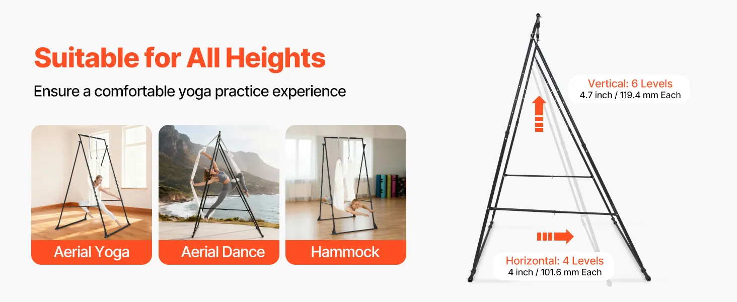 Strong Support Base: Experience sturdy support with this lightweight 42.1 lbs/19.1 kg yoga swing stand that holds up to 440.9 lbs/200 kg. Crafted from premium steel tubing, the frame delivers a stable platform for yoga enthusiasts and professionals alike, ensuring consistent performance and smooth stretching every session