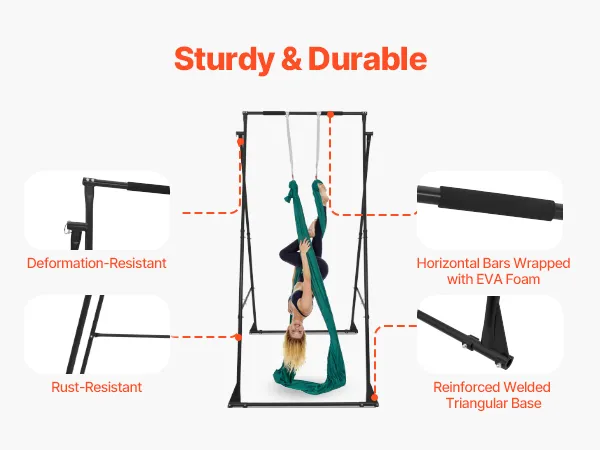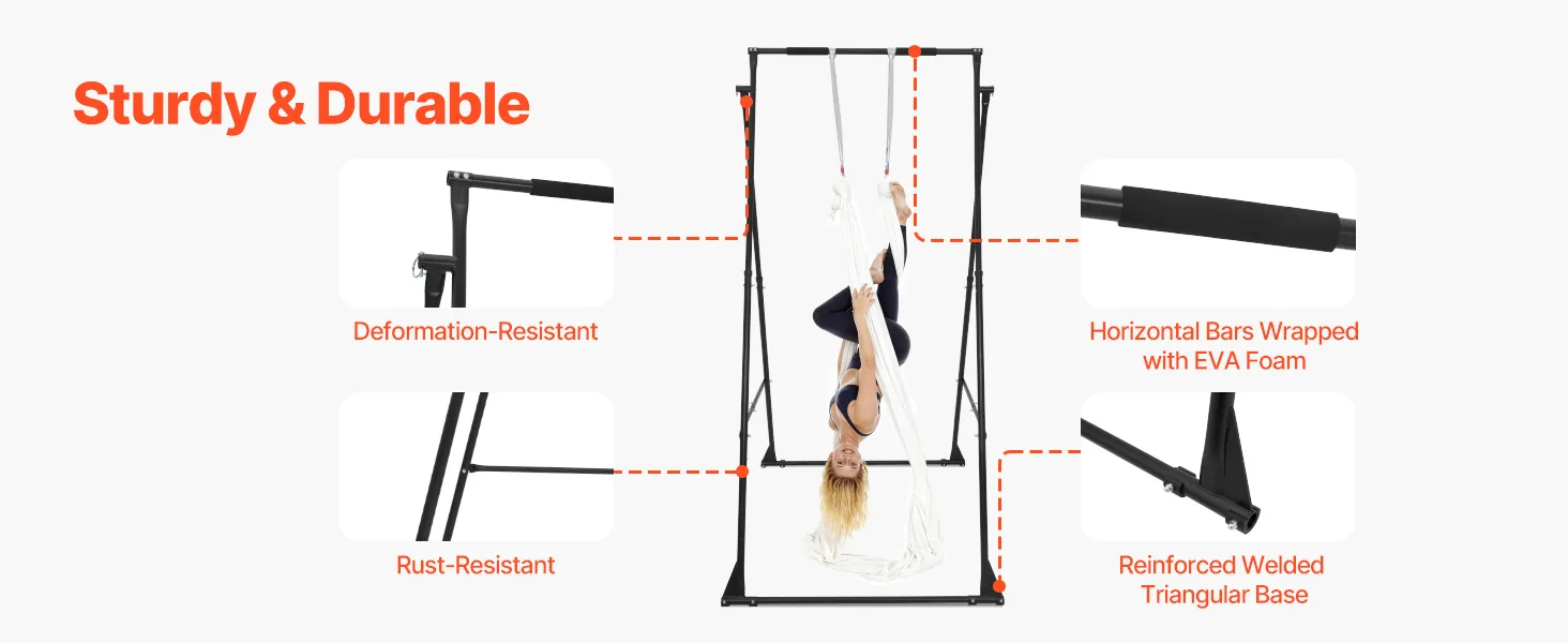 This aerial silk stand offers a triangular frame that ensures stable practice. The weight distribution and slip-resistant feet minimize wobbling, accommodating both beginners and experienced practitioners. Focus on each pose with confidence and enjoy smooth, balanced yoga sessions every time.